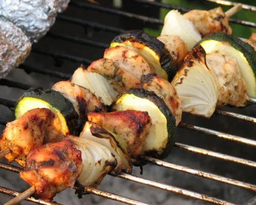 Мангальные шашлыки с курицей и овощами: Начнем с классики - сочные и ароматные шашлыки! Подготовьте куриную грудку, нарежьте ее на кусочки и замаринуйте. Маринад на каждый кусок: 1 с.л ложка оливкового масла, орегано 1/4 ложка, 3-4 листика сухого тимьяна, 5 капель лимонного сока, чеснок 1/4 зубчика, копченая паприка 1/6 ч ложки. Овощи можно положить натереть тем же маринадом. Хватит 3-4 часа для мяса и 1-2 часа для овощей. соль по вкусу.