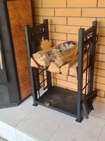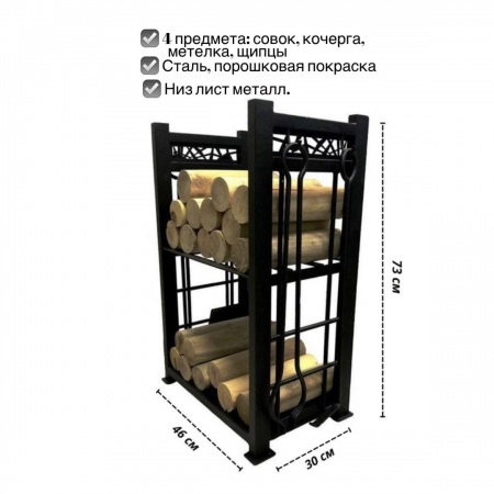 Дровница изготовлена из прочного металла и покрыта порошковой краской, придающей ей долговечность и устойчивость к внешним воздействиям. В комплект входят четыре основных аксессуара для ухода за камином: щетка, кочерга, совок и лопатка. Щетина щетки длиной 5 см позволяет легко очищать даже самые труднодоступные места, а удобная форма кочерги обеспечивает комфорт при использовании.