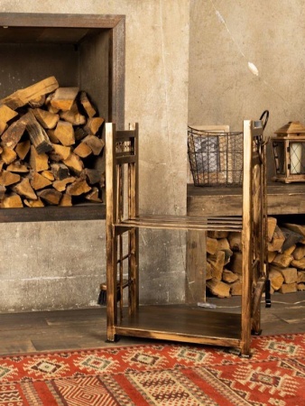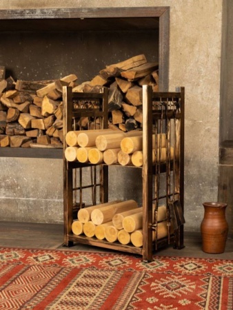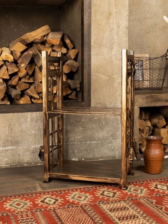 Боковые части дровницы украшены лазерной резкой, создающей изящные лучи. Размер дровницы средний, что позволяет ей органично вписаться в различные интерьеры, включая классические, полу-классические и современные пространства. Цвет античной бронзы добавляет нотку тепла и уюта, делая эту дровницу подходящей для любых помещений, хотя по стилю она ближе всего к направлению лофта.