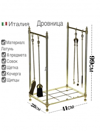 Элегантная металлическая дровница, модель Stilars 01976 с аксессуарами для камина. Набор с дровницей выполнен из желтой блестящей латуни. Эту дровницу с набором предметов для ухода за каминами отличает безупречно выточенные детали. Утонченный классический стиль итальянской дровницы приводит в восторг многих ценителей. Бренд Stilars - один из самых известных европейских производителей дровниц и каминных аксессуаров.