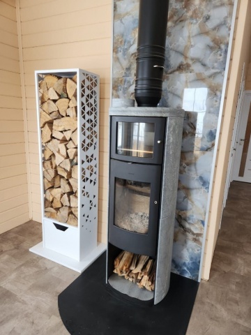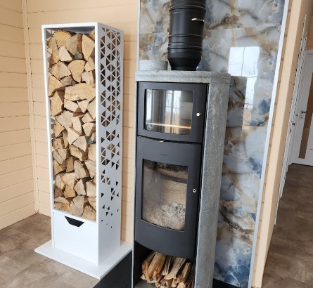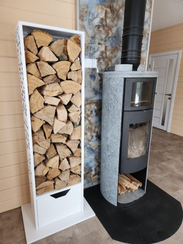После изготовления все швы зачищаются и шлифуются. Сверху наносится порошковая белая краска, после окрашивания дровница отправляется в высокотемпературную печь. Там краска становится жидкой, идеально ровно окрашивает поверхность, проникает вглубь металла. Такая обработка считается лучший на данный момент, металл хорошо защищен и меньше подвержен коррозии и ржавчине, чем при обычной покраске. Поэтому для бани, полузакрытых помещений подходит идеально.
