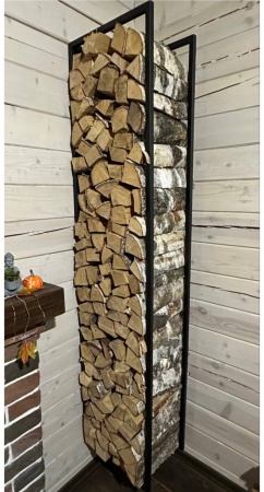Дровница имеет пристенную панель, чтобы дрова не пачками и не карябали обои или краску. И держатели для дров. Дровница создана из металла и покрашена порошковой краской наподобие той, которой окрашивают камины(без повышенной стойкости к высоким температурам). Она подойдет для дома, сарая, бани, зоны барбекю и других помещений. Дизайн дровницы очень простой, но он понравится ценителям простоты и современных интерьеров.
