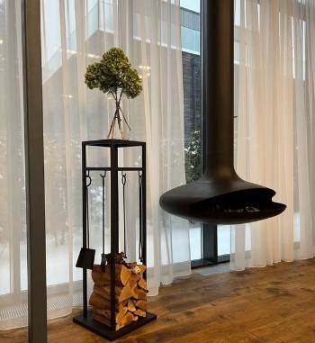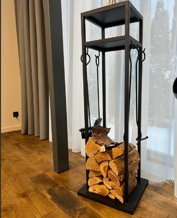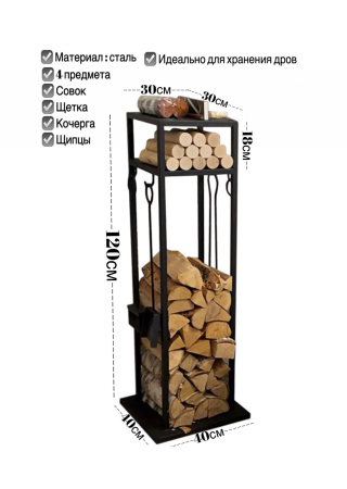 Дровница-стеллаж для дров и щепок с набором для камина/печи SafaMaster "Лофт" D780BK значительно экономит место около камина. Он довольно вместительный, но места много не занимает. Имеет металлическое основание. А на его стенках расположен набор для камина из 4 предметов, они входят в комплектацию.