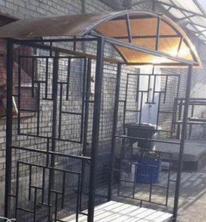 Дровница уличная из металла с крышей из поликарбоната для дачи, частного дома. Простая недорогая конструкция для дачи, поликарбонат сам по себе материал недорогой, поэтому и дровница выходит недорого. Но это сотовый поликарбонат с высокой устойчивостью к высоким температурам, солнечному излучению, морозу. Каркас конструкции- металлическая квадратная профильная труба 30 мм на 30 мм, длина модели 2 метра, глубина 80 см. Высота 2,5 м (в центральной части крыши).