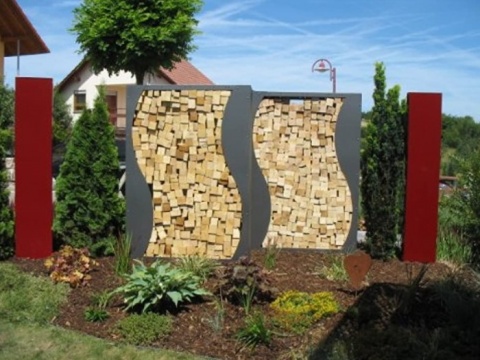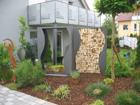 Эта стильная модель создана из высококачественной листовой стали, покрыта антикоорозиным раствором, сверху серой краской. Такой уличный дровник служит не столько вместилищем для дров, но и украшает участок и дополнит дизайн.