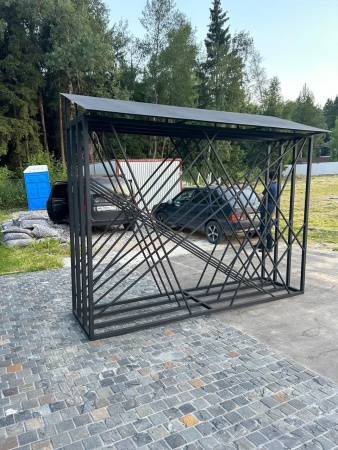 Дровник создан в стиле лофт и подойдет к любому современному дизайну участка. Профильная труба 20-ка внутри и 40-ка по внешнему контуру. Его можно поставить к забору, дому, сараю. Тогда дрова будут полностью защищены. Ребра жесткости служа в этой конструкции и разделителями для ров. Крыша защищает сухое топливо от осадков.