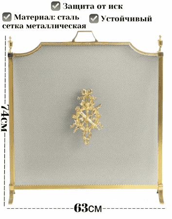 Экран имеет 1 створку, основа- мелкая сетка, её обрамляет рамка из желтой латуни. Имеет небольшие классические украшения сверху и ручку, стилизованную под украшение. Рамку из литой латуни. И небольшое латунное украшение в центре.