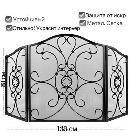 Защитный экран для камина является необходимым дополнением к камину в плане безопасности его эксплуатации. Нечаянно вылетевшая из камина искра может стать причиной большого пожара, поэтому производители постарались максимально обезопасить своих клиентов с помощью этого аксессуара. Но этот камин с орнаментом в виде ковке станет еще и отличным украшением каминной зоны. Состоит экран из 3 створок, его при необходимости сложить и убрать.