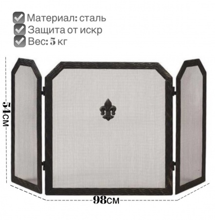 Высота 54 смШирина трех секций 98 смМатериал: стальЦвет: состаренная бронзаМеталлический экран для камина необходим для защиты дома от искр, он устанавливается перед камином и гарантирует защиту от искр, а сам очаг от детей и животных. Эта модель имеет импортную металлическую сетку внутри с диаметром отверстий 2 мм. Такая сетка называется тканой, она плетется из металлической проволоки как ткань и так же как ткан восстанавливается. Окружает ее металлическая рамка, экран довольно тяжелый и устанавливается прочно, его будет трудно будет выдвинуть ребенку или животному, а вот взрослый человек легко с этим справиться. У модели имеются 3 створки, благодаря чему его удобно ставить и регулировать. Такой защитный экран подойдет для печи, камина, мангала, барбекю.Экран декоративный, он еще и украсит помещение. Рамка декорированная интересным кованым элементом и минималистичной элегантной отделкой подойдет к большинству интерьеров.