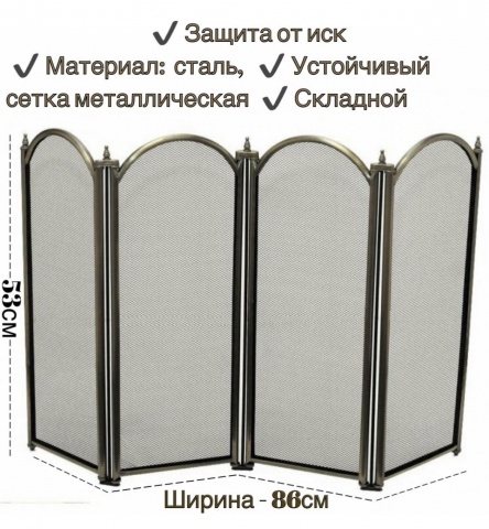 Экран для камина из металла четырехстворчатый. Створки легко и просто регулируются и устанавливаются в нужном положении. Модель экрана среднего размера. Она довольно легкая. Отличается универсальным стилем и формой. Защитит дом от искр и украсит каминную зону.