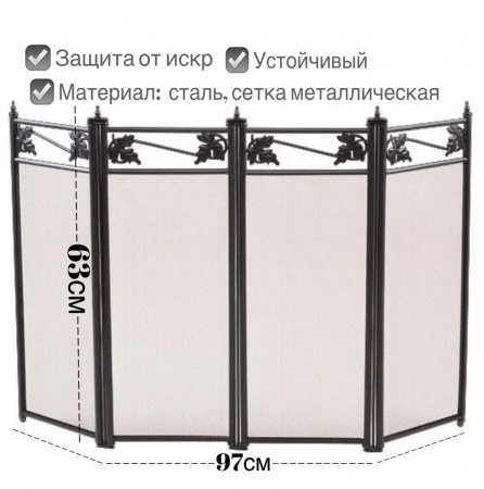 Металлический защитный каминный экран С04044AB с 4 створками. Модель экрана довольно интересная. Функциональная часть экрана обычная. А сверху на створках идет имитация ковки с виноградными листьями на ней.