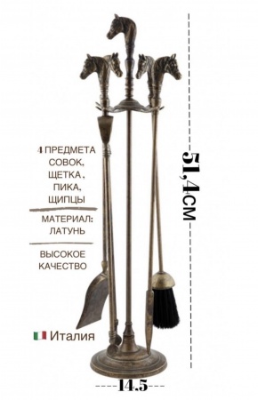 Каминный набор "Лошадь" Stilars 130514 из латуни создан итальянской фирмой Stilars-одним из самых известных брендов, создающих стильные каминные аксессуары. На небольшой подставке 4 предмета по уходу за камином: щипцы, метелка, совок и кочерга. Длинные удобные ручки, держатели в виде головы лошади. Длинная щетина метелки.