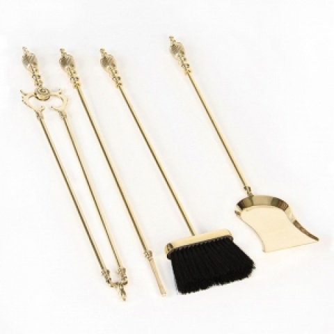 Набор для камина из 4 предметов: совок, метелка, щипцы, кочерга, расположены на подставке. Сделан набор из желтой блестящей латуни итальянской фирмой Stilars. Stilars-одна из самых известных европейских фирм, производящая аксессуары для каминов премиум класса.