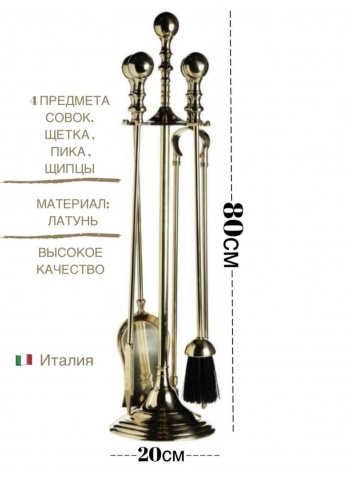 Классический каминный набор из 4 предметов для камина и стойки-держателя, выполнен из желтой блестящей латуни. Изготовлен методом литья, все формы очень четкие. Прекрасно впишется в классический/полуклассический интерьер. Набор состоит и багра, метелки, совка.