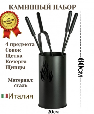 Набор для камина из 4 предметов в ведре Comex 50.615F итальянский. На ведерке выдавлен оригинальный рисунок рисунок. Набор для камина черного цвета, с черными ручками. Настоящее европейского качество. Качественное крепление предметов к ручке, длинные ручки предметов, такими инструментами удобно будет убирать любой очаг. Длинный ворс на щетке, щетка выметет хорошо пепел даже из углов. Такой набор будет служить очень долго.