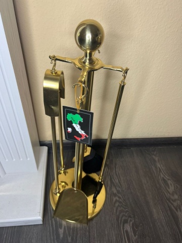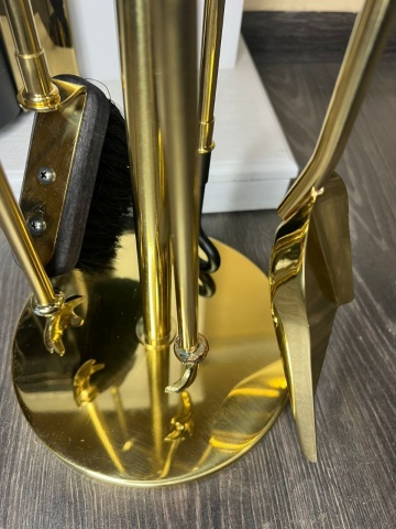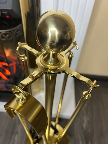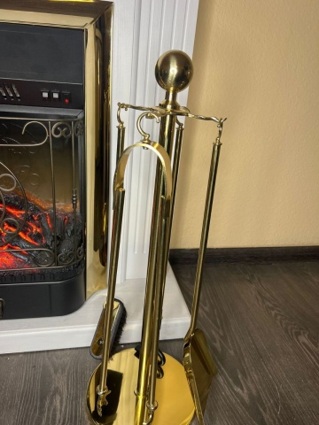 Набор для камина из латуни под цвет золота, в наборе : щетка, щипцы, совок, кочерга. Все инструменты с длинными ручками, что позволяет использовать их для камина и печи, инструменты размещены на устойчивой подставке с круглым основанием. Создан набор в стиле современная классика, гармонично смотрится рядом с камином, удобен и практичен в использовании.