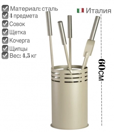 Компактный каминный набор из 4 предметов 70.200 IS, произведен набор Comex, хорошо известным в Европе и СНГ брендом каминных аксессуаров среднего и премиум класса. Подставка круглая типо ведро, украшением сулужат прорези, сделанные методом лазерной резки. Лазерная резка предотвращает появление сколов и зазубрин. В наборе 4 предмета: совок, метелка, кочерга, каминные щипцы. Длинна аксессуаров средняя, держатель удобно держать в руках.
