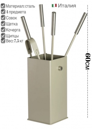 Набор для камина серо-серебристого цвета в прямоугольной подставке, которая оснащена устойчивым прямоугольным основанием и ручкой для удобства опрокидывания.