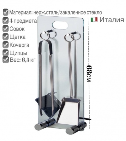 Каминный набор стальной, 4 предмета 90.919 . Набор без сойки в комплекте, подойдет если на дровнице есть крючки. Или нужны дополнительно крючок на стенку. Каминный набор сделан из шлифованной нержавеющей стали и по виду напоминает серебро. Создан итальянской фирмой Comex, известным европейским брендом, производящим стильные аксессуары для каминов, печей и дома.
