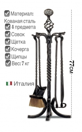 Аксессуары для камина набор кованый из 4 предметов К102 традиционного черного цвета и классического дизайна от итальянской фирмы COMEX. Стойка с кованой скрученной фигурой вверху, в середине стойку украшает скрутка. На стойке кованые крючки для аксессуаров. На крючках 4 предмета для ухода за камином/печью : щетка, совок, кочерга и щипцы. Коваными элементами украшены и длинные ручки предметов. Ковка придает всем предметам более классический вид и делает металл более долговечным.