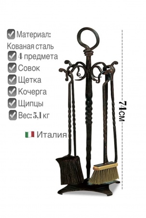 Набор кованных аксессуаров для камина из 4 предметов K136 черного цвета и оригинального дизайна от итальянской фирмы COMEX. Простая стойка со скруткой в середине, а на ней крючки для предметов. На крючках расположены 4 аксессуара для камина: щетка, совок, кочерга и щипцы. Набор для камина украшен коваными элементами Ковка делает металл более долговечным, он становится более прочным и гибким, а поверхность менее зернистой. В каминном наборе 4 предмета с длинными ручками: совок, кочерга, щетка, щипцы. Сама стойка с крючком вверху, поэтому при необходимости ее можно повесить.