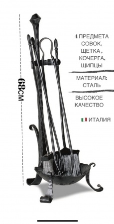 Каминный набор кованый черного цвета и оригинального дизайна от итальянского бренда COMEX. Подставка под аксессуары выполнена в виде мини-дровницы с широкими ножками. На подставке крепится стойка, на которую опираются предметы. Ножки, стойка кованые. Коваными элементами украшена стойка и предметы, она есть на концах всех аксессуарах, кроме щипцов. Ковка делает металл более долговечным, он становится более прочным и гибким, а поверхность менее зернистой. В каминном наборе 4 предмета: совок, кочерга, щетка, щипцы.
