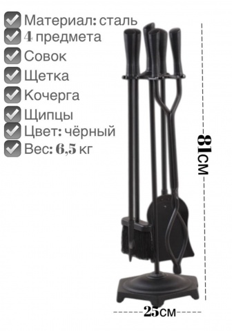Выполнен из качественной стали. В наборе стойка стойка с удобной подставкой, на которой расположены 4 предмета: щетка и совок, для того чтобы убирать мелкий мусор и золу, щипцы для того, чтобы подбирать упавшие угли и возвращать их в камин, кочерга, для того чтобы поправлять поленья, а также подставки для хранения всех элементов. Такой набор можно использовать для украшения электрического камина. Или убирать отопительный прибор.