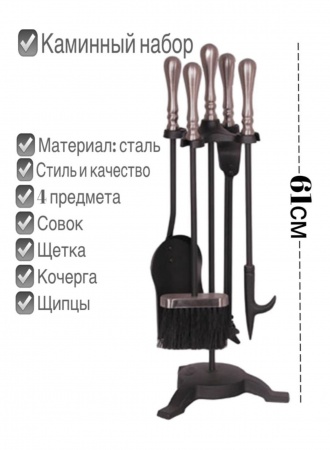 Простой каминный набор T15083SNK с оригинальной подставкой, похожей на ножки стула или банкетки. Доставать предметы очень удобно, они расположены по кругу на специальных держателях. Для изготовления использованы сталь и чугун. В наборе 4 предмета: щетка, совок, кочерга и щипцы. Цвет: черный с серебром. Высота небольшая, поэтому перед покупкой нужно померить ваш отопительный прибор. Подойдет для небольшого камина, печи.