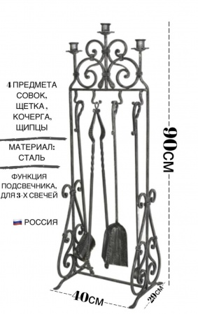 В наборе подставка из стали, украшенная коваными элементами в виде вензелей на ножках и сверху. Сверху крепятся крючки, на которых расположены 4 предмета из каминного набора: кочерга, щипцы, совок и щетка.