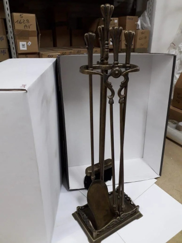 Каминный набор представляет собой полный комплект всех необходимых при уходе за домашним дровяным камином аксессуаров, устанавливаемых в специальную стойку. Каждый предмет снабжен длинной удобной ручкой сверху заканчивающейся фигурным окончанием. Снизу основания площадка с чеканным обрамлением, которая служит для сбора случайного мусора при пользовании аксессуарами.