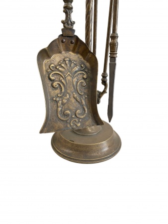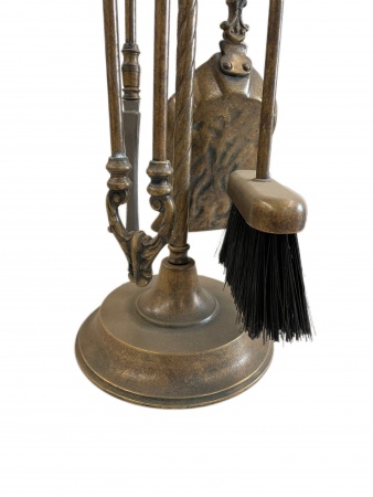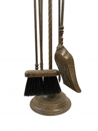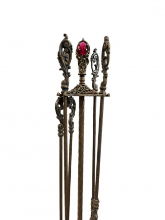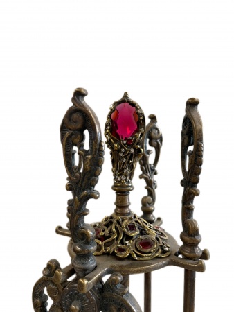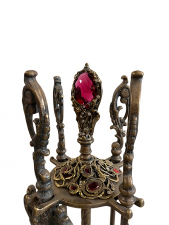 Каминный набор необходим если в доме есть дровяной камин. В комплекте совок, метелка, щипцы и кочерга, закрепленные на устойчивой подставке. Все эти предметы способны облегчить уход за топкой камина и помогут поддерживать чистоту вокруг каминного уголка. Ручка каждого элемента украшена чугунными резными изогнутыми элементами, закрепленный на держателе красивый рубин завершает композицию.