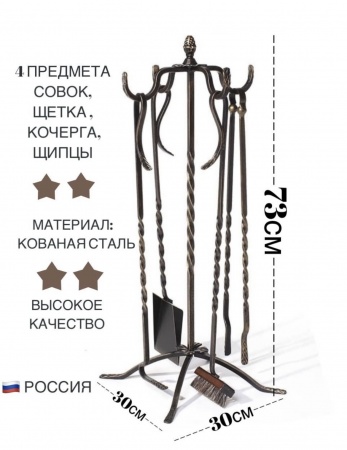 Набор аксессуаров для камина из 4 предметов, кованый. SafaMaster KN763-это держатель для каминного набора на ножках и 4 предмета: кочерга, совок, щетка и щипцы изготовленные методом горячей ковки. Горячая ковка делает металл более волокнистым, а поверхность менее зернистой. Поэтому набор для камина, выполненный методом горячей ковки может прослужить не одно десятилетие. Держатель выполнен в классическом стиле и на нем крючки для предметов. Ручки у предметов каминного набора длинные и украшены скруткой. Щетка - самое уязвимое место в любом наборе, но тут она сделана на 5+. Надежные крепления, щетина 5 см, которая может удалять золу и пепел даже из труднодоступных углов.