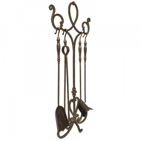 Кованые вензеля украшают подставку для каминного набора сверху и сделаны в качестве подставки на стойке, ручки аксессуаров. Металл выбран качественный, а ковка делает металл менее зернистым и более волокнистым, + порошковая краска и запекание в печи. Поэтому такой кованый набор для камина долговечен, не облазит, а ломаться тут нечему. В набор KN800AGK входит: совок, кочерга, щетка, щипцы. 3 цвета на выбор: бронза, черный, серебро. Высота: 90, см, ширина: 35 см. Высокий, но не широкий.