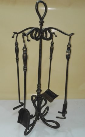 В набор для камина кованый входит: совок, кочерга, щетка, щипцы. 4 цвета на выбор: чёрный с золотой патиной, черный с серебристой патиной, черный с медной патиной или просто чёрный. Высота подставки : 93 см, Ширина: 36 см. Компактный, но тяжелый из-за ковки