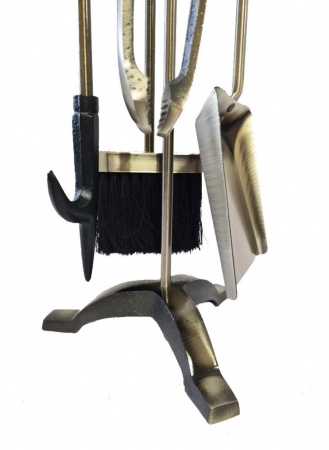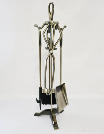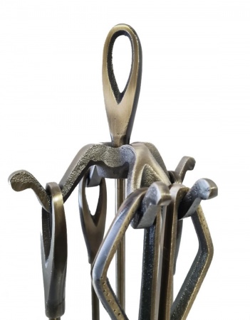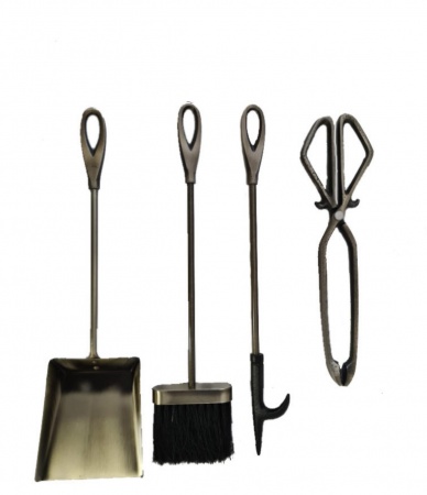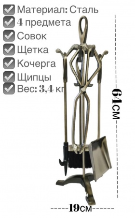 Главный плюс этого набора: он небольшой и не займет много места. Держатели на ручках большие, эргономичные, выполнены в виде капельки. Цвет металлический. Выглядит достаточно эстетично и подходит для большинства каминных зон. Состоит из 4-х аксессуаров: кочерга, совок, щетка, щипцы