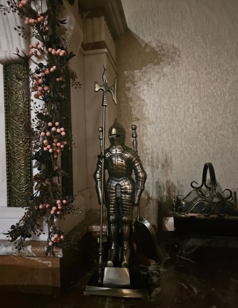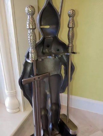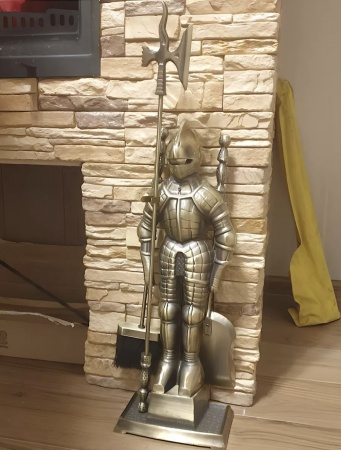 В наборе рыцарь в латах, стоящий на подставке, для охраны камина, высота 92 см. Для помощи рыцарю в комплект входит: багор, совок и щетка. Создан из литой стали и чугуна. Цвет: античная бронза.