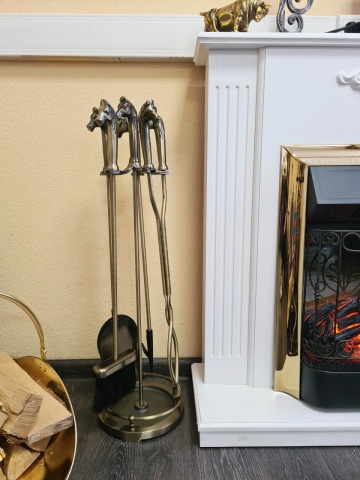 Набор для камина включает 4 предмета: совок, щипщы, щетку, кочергу на подставке. Сделан из металла, имеет удобные эргономичные ручки. Подойдет к  обюому интерьеру и станет украшением каминной зоны.
