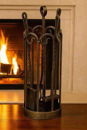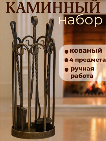 Металлические аксессуары для камина/печи набор из 4предметов, кованный. SafaMaster KN751AGK выполнен нашими мастерами вручную. Использован метод горячей ковки. Может быть в черном цвете или в цвете бронза. Для набора предусмотрена подставка типо ведро и 4 предмета для ухода за камином/печью. Подставка сверху украшена небольшими коваными элементами, а внизу небольшим орнаментом под старину. В этот каминный набор входит: совок, щетка, кочерга и щипцы. У предметов эргономичные длинные ручки.