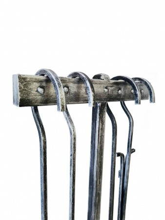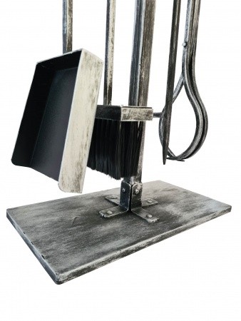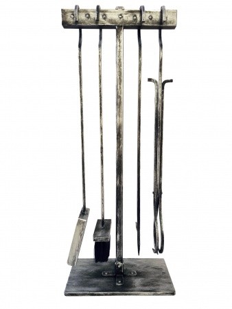 Он располагается на широкой металлической подставке. К подставке прикреплен штатив с поперечной перекладиной. На которой и размещен каминный набор. В набор входит 4 предмета. Длинные удобные ручки, надежное крепление+ кованая сталь. Он прослужит десятилетия.