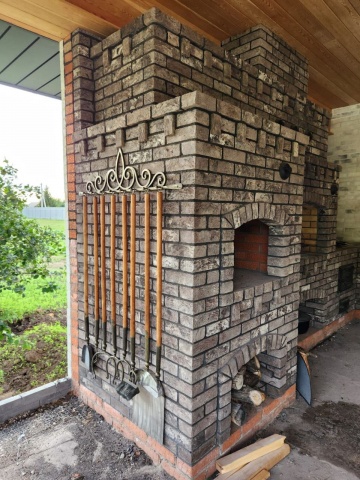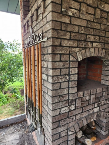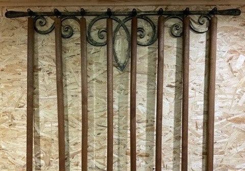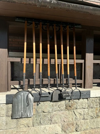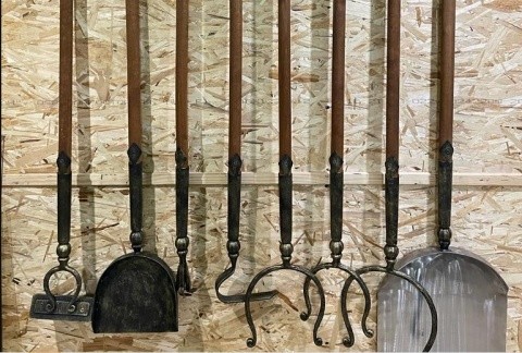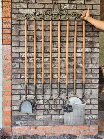 Набор для русской печи кованый с деревянными ручками предметов. В наборе 3 ухвата разного диаметра, хлебная лопата широкая, совок, щетка, кочерга финская, чапельник для сковородок без ручки +планка-держатель с крючками. Ручки предметов длинные, дерево хорошо обработано, металл отличного качества.+ ковка еще улучшает характеристики металла. 1120 ширина ковки