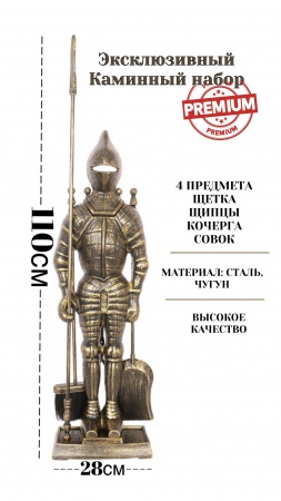 Каминный набор "Рыцарь большой с аксессуарами для камина", 4 предмета, 110 см создан из металла: сталь и чугун, сверху гальваническое покрытие, которое и позволяет приобрести ему цвет античная бронза. Доспехи проработаны тщательно, и вид его очень интересный. Рыцарь с удовольствием защитит ваш очаг и поможет убрать его. За спиной его 3 аксессуара, щипцы, щетка и совок. + багор в руках фигурки. Щетка имеет достаточно длинный ворс, совок не очень глубокий, но достаточно длинный. В целом предметы длинные и их длинны хватит для уборки камина, печи.