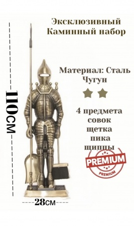 Каминный набор "Рыцарь большой с аксессуарами для камина" D98051AB на подставке, 4 предмета, 110 см создан из металла: сталь и чугун, сверху гальваническое покрытие, которое и позволяет приобрести ему цвет античное золото/черный. Доспехи сделаны тщательно, и он действительно напоминает статуэтку рыцаря. Рыцарь защитит ваш очаг от врагов и поможет убрать его. За спиной фигурки 3 аксессуара для камина: щипцы, щетка и совок. + багор в руках. Получается полный комплект аксессуаров. Щетка имеет довольно длинный ворс, совок не очень глубокий, но достаточно длинный. Длинны предметов хватит для уборки даже большой печи.
