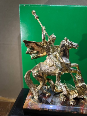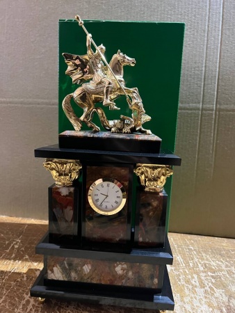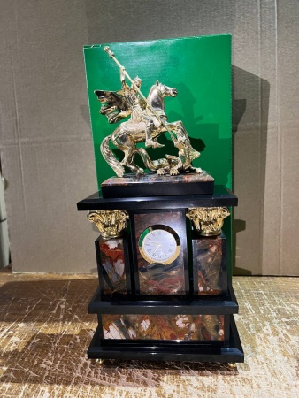 Часы из натурального камня (яшмы) с фигуркой из бронзы Часы настольные, для камина  камень / бронза "Георгий Победоносец" 003568