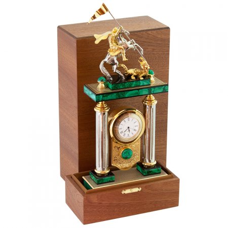 Часы из натурального камня(малахита) настольные, для камина  камень / бронза "Георгий Победоносец"  006454