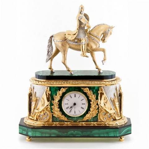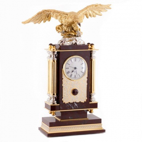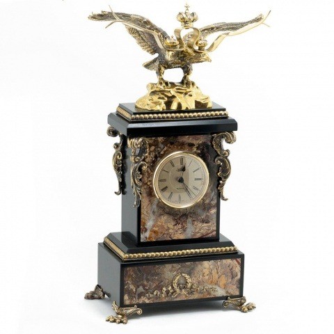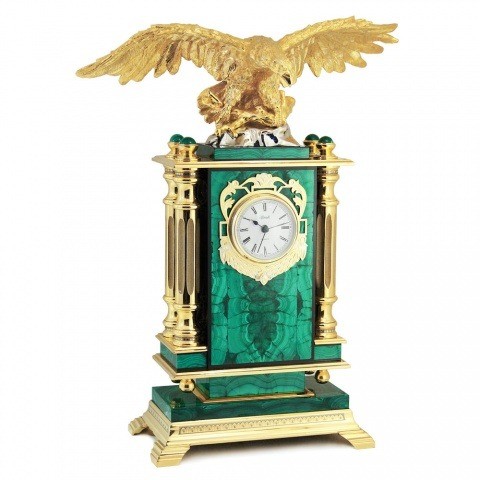 Часы «Орел» (SafaMaster) из малахита и бронзы выглядят по-царски. Эксклюзивность изделию придает выполнение работы вручную. Такой подарок порадует даже самого сдержанного человека.
