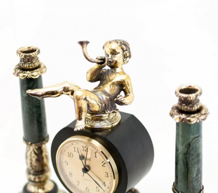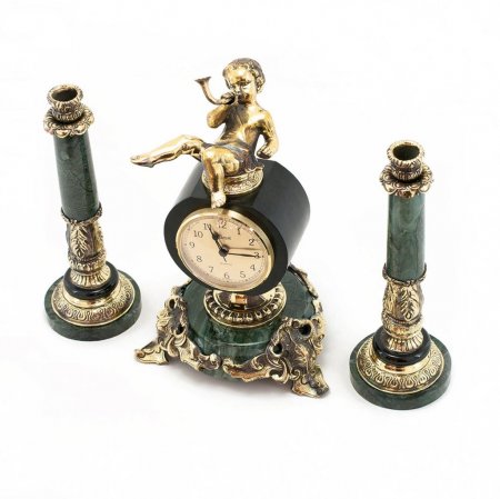 Часы из камня для камина, в гостиную "Амур и Психея" камень малахит 003054
