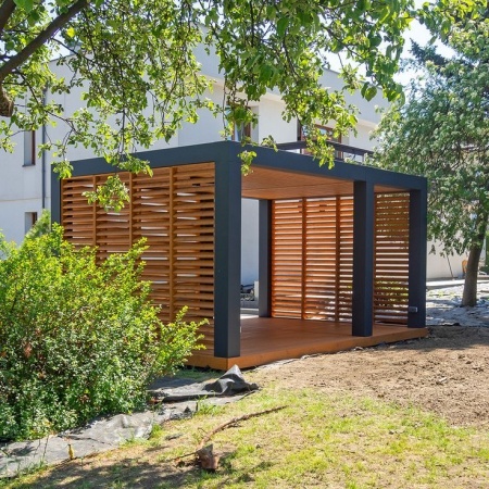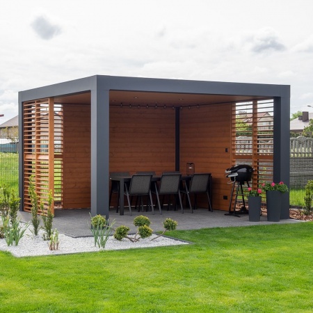 Элегантность и стиль: Современное сочетание металла и дерева придает беседке изысканный и уютный вид.