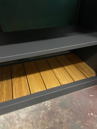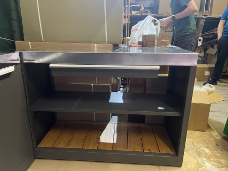 Практичное рабочее место с большой столешницей из нержавеющей стали и встроенным выдвижным ящиком для кухонных инструментов. Также имеются деревянная полка и дополнительная полка с регулировкой высоты, предоставляющие дополнительное пространство для продуктов и посуды. Этот стол идеально впишется в любой дизайн уличной кухни, сочетая стиль и функциональность.