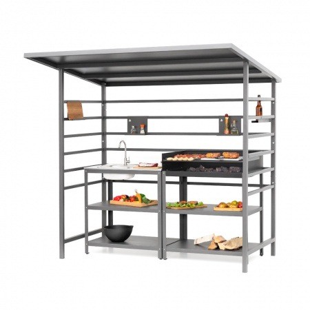 Металлический навес для гриля защищает от осадков огонь и вас. И под ним же можно хранить кухонные принадлежности.