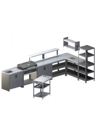 Кухонный модуль с надёжной и устойчивой конструкцией. Усиленная столешница из нержавеющей стали. Модуль можно встроить в любые конфигурации благодаря угловому дизайну. Вместительные полки для удобного размещения предметов. У заднего края стола есть ограничитель от падения предметов. Нержавеющая мойка 38×38 см